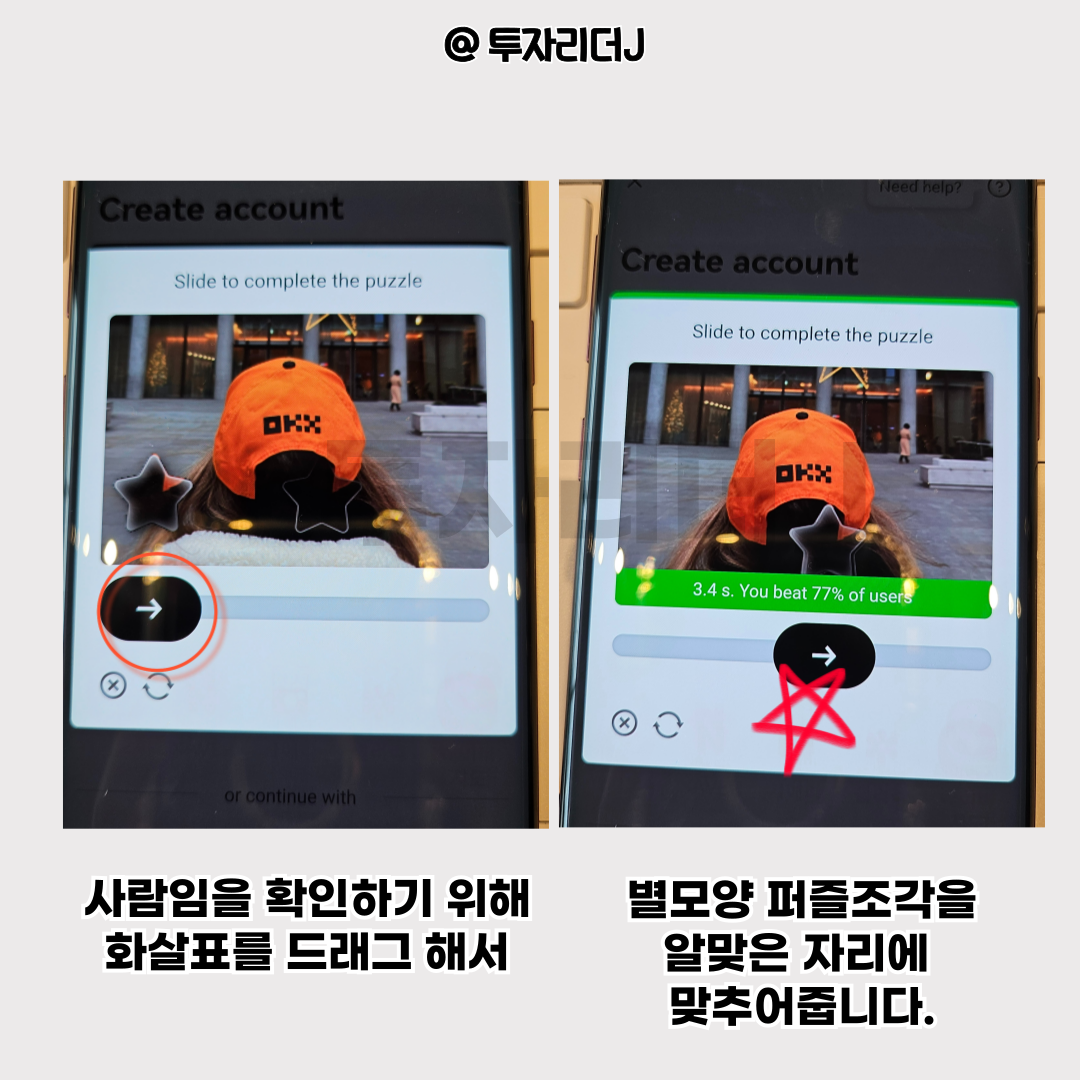사람임을 확인하기 위해 화살표를 드래그 해서 알맞은 모양의 퍼즐 위에 갖다놓습니다.