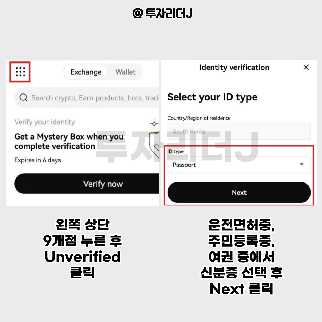 회원가입은 완료되었지만, 거래를 하기 위해서는 신원인증 KYC 단계를 거쳐야 합니다. 왼쪽 상단 9개점을 누른 후 unverified를 클릭합니다. 아직 신원인증이 되어 있지 않다는 것을 의미합니다.인증에 사용할 운전면허증, 주민등록증, 여권 중 신분증을 선택한 후 next를 클릭합니다.